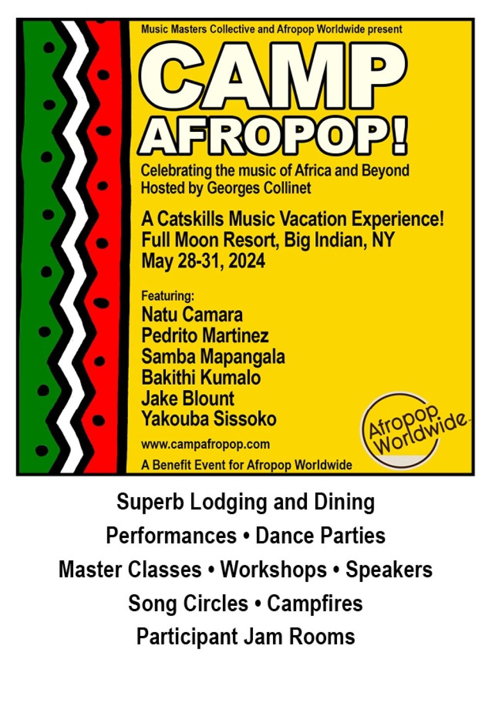 Finally, we are excited to roll out the inaugural edition of Camp Afropop, a three-day immersive experience from May 28-31 at the Full Moon Resort in the beautiful Catskill Hills near Woodstock, N.Y. We've curated a rich experience featuring concerts, workshops, master classes, late-night jams, dance parties, song circles, campfires, and, very cool, hang time with the artists, which we know will delight everyone. Our artists for Camp Afropop 2024 include Natu Camara from Guinea, Afro-Cuban Grammy-nominated conguero Pedrito Martinez, an encore Afropop Dance Party with Samba Mapangala and Soukous Stars, virtuoso kora player Yacouba Sissoko from Mali, bass master Bakithi Kumalo of Graceland fame from South Africa, and multi-instrumentalist and singer Jake Blount, evoking styles from overlooked African American traditions.