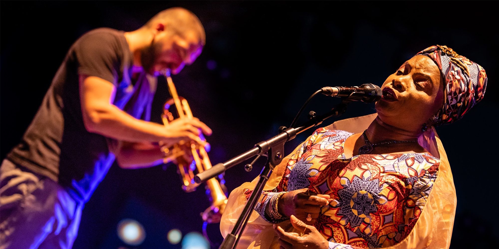 Angelique: You know what? I have met wonderful musicians all over the world. I've played on the stage with Wayne Shorter and people who are really talented. But there's talent, and then there's something on top of it. When you play an instrument, are you executing what you planned? Or are you talking through your instrument? It could be guitar. It could be drums. When you hear Ibrahim play the trumpet, you hear the trumpet, you hear a melody, but you also hear a voice. You hear a singer. You hear a complete musician, which is very rare to have. And I'm not saying this because he's here. This is what I felt the first time I heard him. After that I read an interview in which he said he would like to work with me.