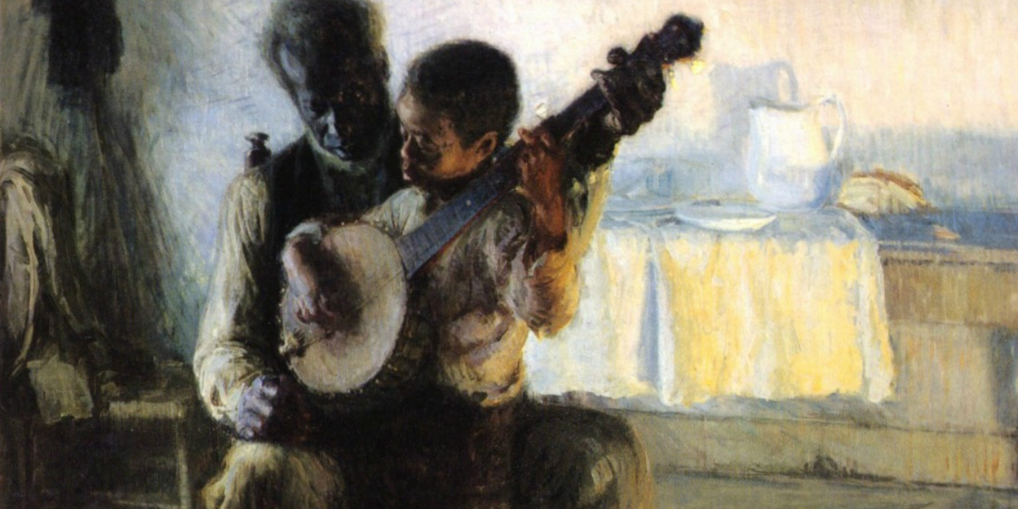 From 1893 we have this beautiful painting by Henry Ossawa Tanner. It's used on the cover of the Folkways collection Black Banjo Songsters of North Carolina and Virginia, and for understandable reasons. The painting was the first of Tanner's to be accepted into the Paris Salon in 1894. His previous entry, The Bagpipe Lesson, was not.
