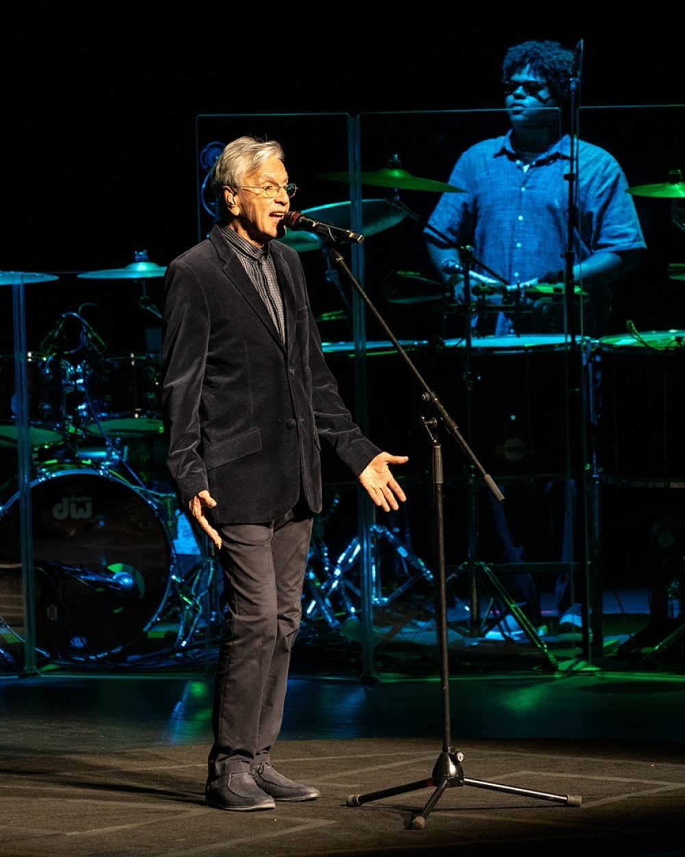 For Caetano, it was a return to BAM — not with his friend and frequent collaborator Gilberto Gil — but with his talented, multi-instrumental band: Lucas Nunes on guitar and keyboard, Rodrigo Tavares also on keys, Alberto Continentino on electric bass, Kainã do Jêje, Pretinho da Serrinha, and Thiaguinho da Serrinha on percussion.