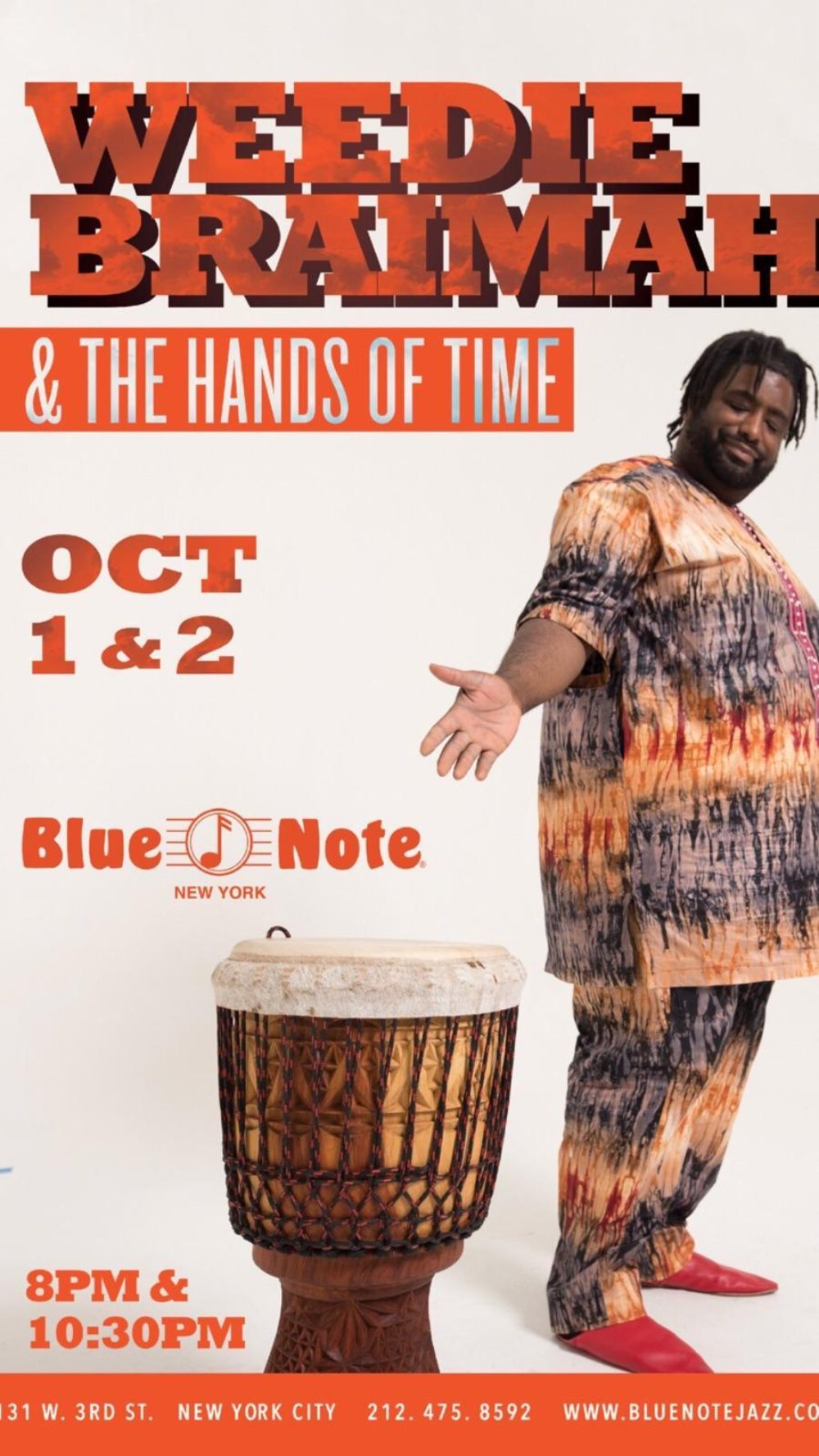 Last year, djembe maestro Weedie Braimah put together a remarkable summit of jazz, Latin and African roots musicians for an inspiring show at the Blue Note. Weedie Braimah and Friends was a kind of proving ground for Braimah’s trademark approach to using the djembe drum as the centerpiece of a contemporary ensemble. This year, on Oct. 1 and 2, Weedie returns to the Blue Note with a smaller group of New Orleans-based musicians. The Hands of Time is the next phase in Weedie’s singular evolution as a bandleader.