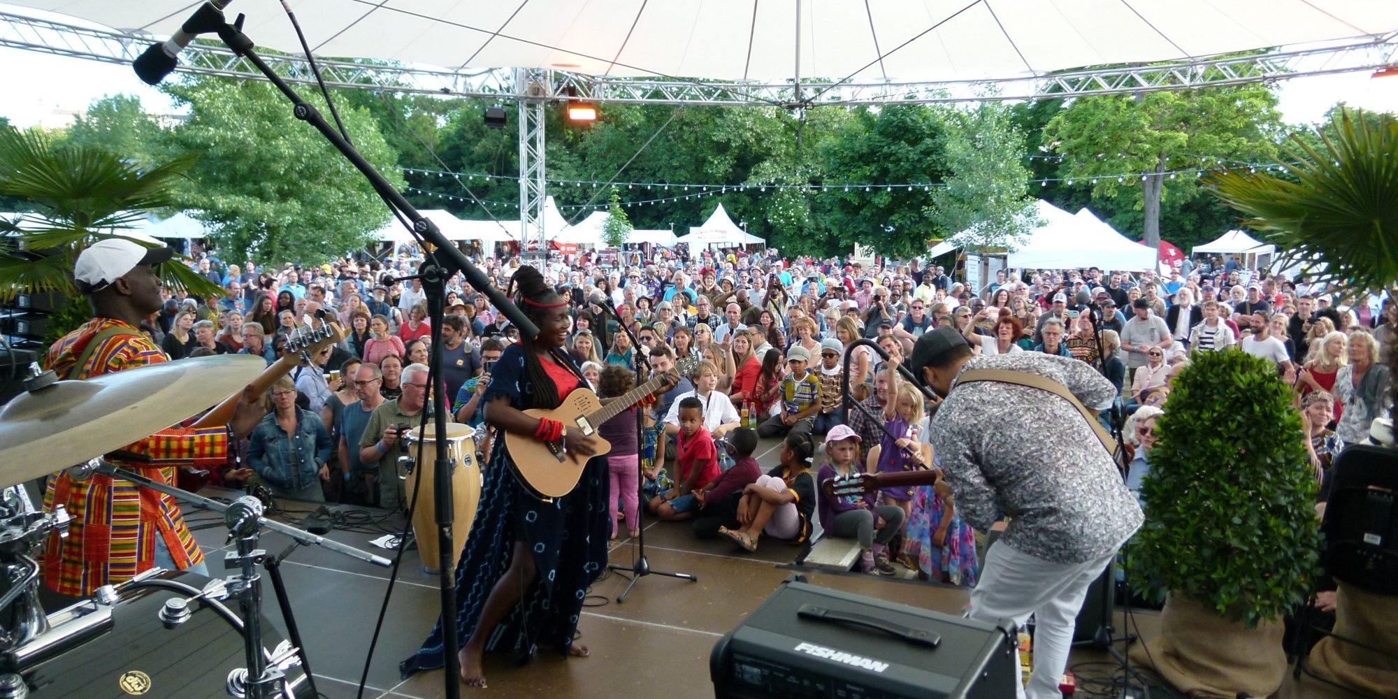 The four-day festival took place May 26-29 along the Main River in a large park within the city and stretched the length of four or five blocks. There were two stages, a smaller day stage which featured new and upcoming performers, daily Senegalese storytelling times for children (and adults), African fashion shows and deejay sets. The larger main stage is used only in the evenings for the headlining performers. Branching out from the main drag, there were many booths selling African clothing and trinkets, African food stalls, stands of non-profit organizations describing their work in Africa which the festival's foundation supports, and at the far end there was even an outdoor cinema, showcasing films from or about Africa. Off-site, there were photo and art exhibits at locations around the city. While over the last two years, due to the pandemic, the organizers had significantly reduced the size and breadth of the festival; this year they expanded to about three-fourths their pre-pandemic size. Attendees came from all over Germany and the rest of Europe.