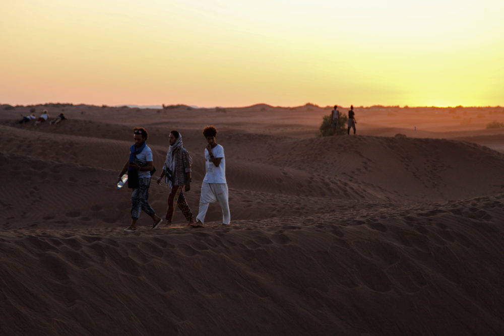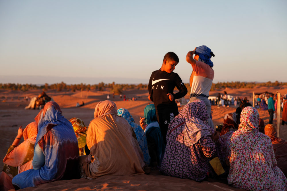 The daytime activities seemed to be curated for the foreign visitors. Camels raced and people played “nomadic hockey,” neither of which really happens outside of the tourist context. Conferences on nomadism and climate change sleepily took place in the afternoons. An NGO that employs local women to make rugs from old Dutch rags held daily weaving sessions. Sbai led a tour of the nearby oasis, the crumbling ruins of an abandoned kasbah and a town being slowly swallowed by the sands.