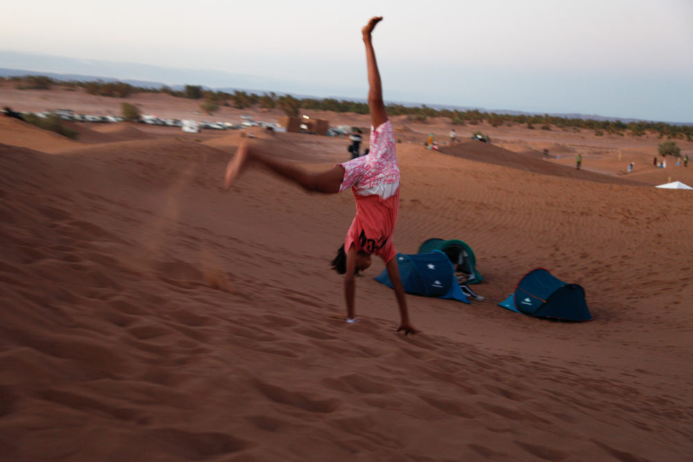 Moroccan city kids set up tent cities under the shade of gnarled tamarisk trees and in every pocket of the dunes. Walking through them at night was like scanning radio channels, with one crew strumming guitar and the next blasting techno and waving laser pointers through the campfire smoke.