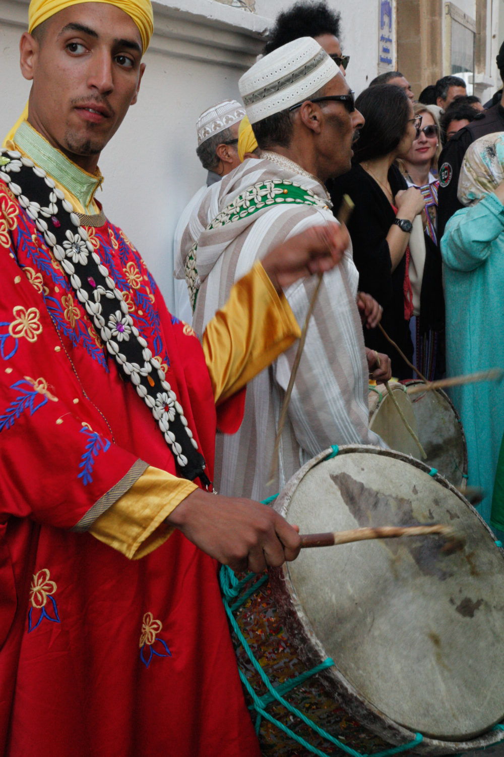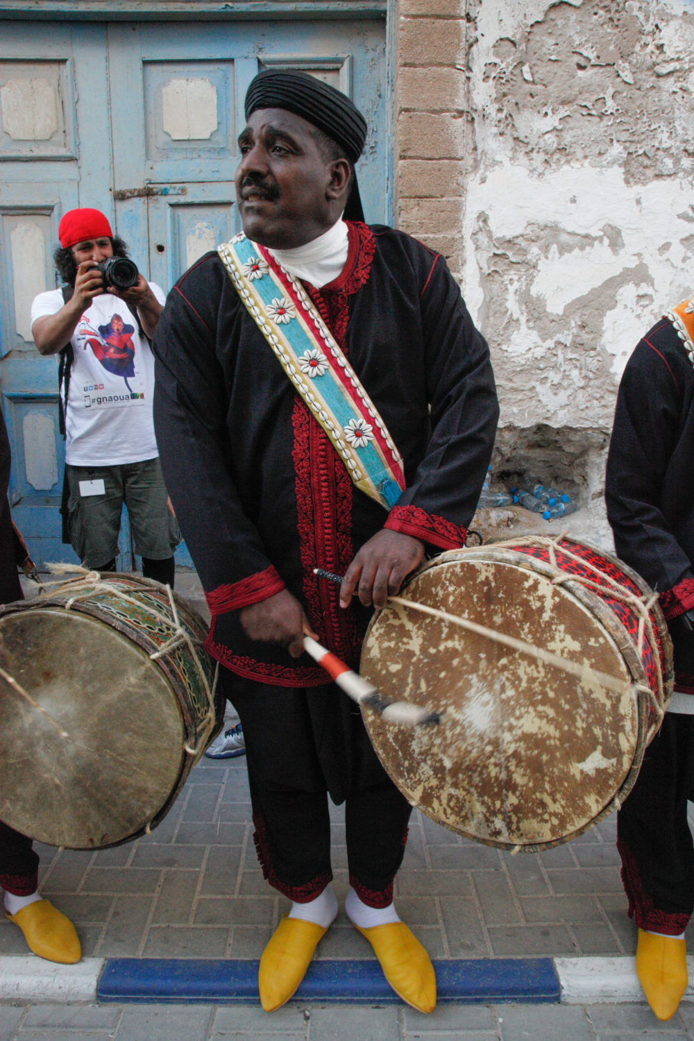 One grand avenue runs down the length of Essaouira’s medina (old city), between the old stone gates of Bab Doukkala and Bab Mechouar. To set the festival in motion, a parade of Gnawa marched down that road, one maalem after the other, followed by his kouyous (singers who play the big metal castanets called krakeb). As is typical at the opening of a Gnawa performance or a ceremonial lila, the maalem played the big barrel drum called tbel, rather than the three-string guembri (alternately known as sintir or hajhouj). Thundering rhythms from the tbel and krakeb ushered in the inundation of Gnawa that would permeate this port town for the next three days.