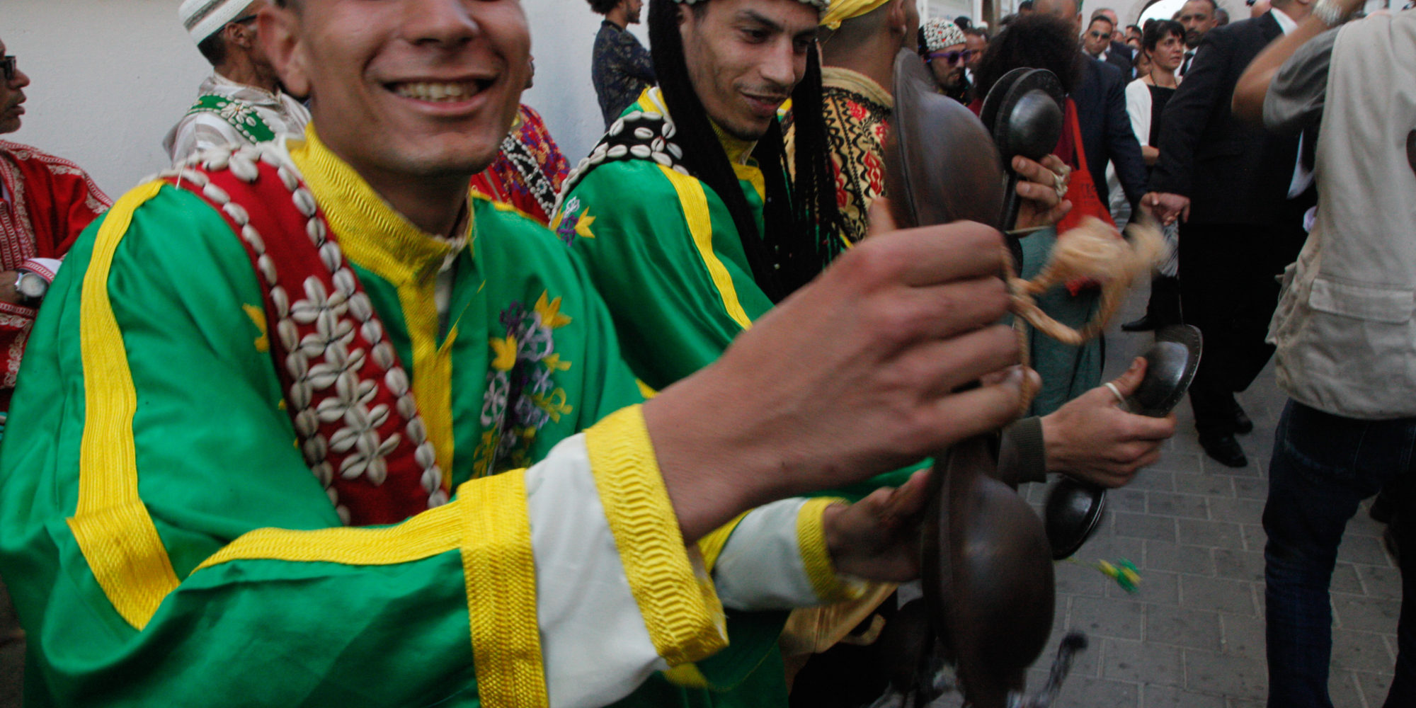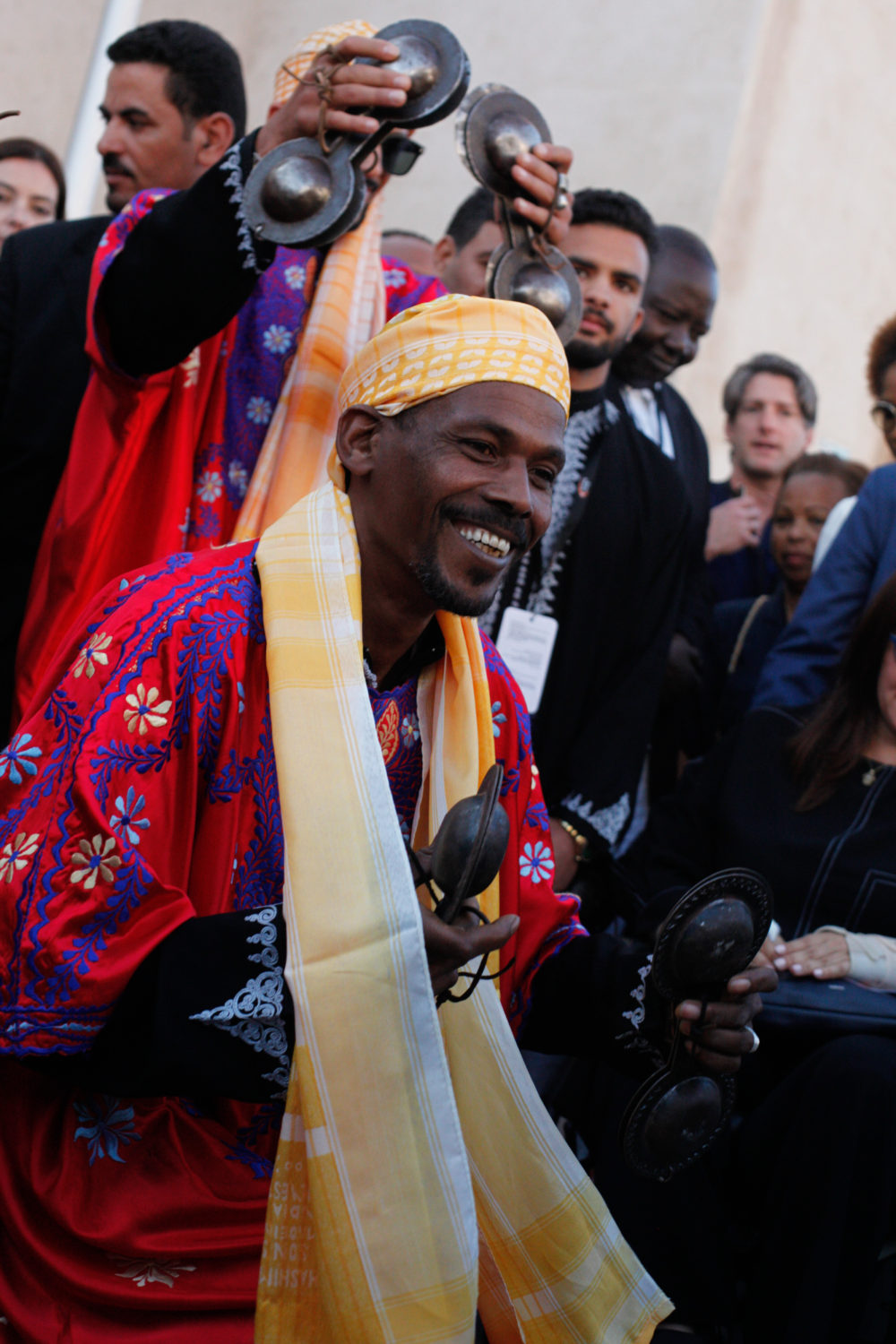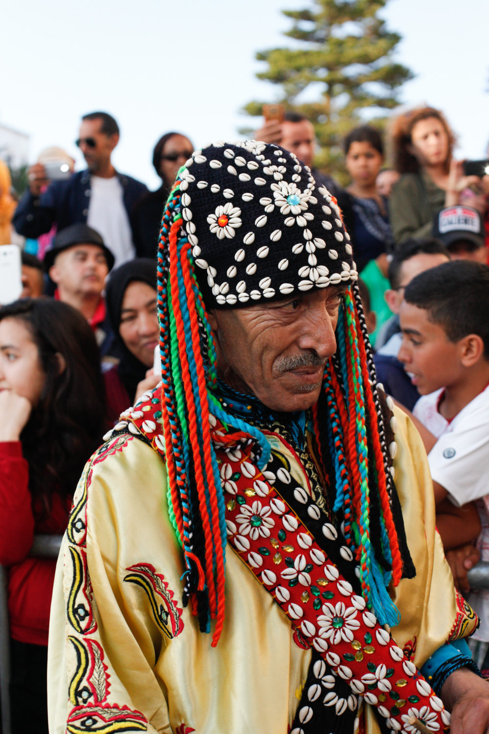 The street was absolutely overflowing with people crammed up against the barricades from start to finish. Everyone from grandparents to infants came out in full force to watch les grand maalems on parade. Each maalem brought his own style from every part of the country, from Tangier to Agadir. Once they had reached Bab Mechouar, the Gnawis lined up on the final stretch, offering their songs one by one to a party of luminaries like festival founder Neila Tazi, and André Azoulay, senior advisor to King Mohammed VI, Essaouira native and major promoter of the festival. Azoulay plays a powerful role in the Moroccan cultural scene and has been a zealous advocate for his hometown.