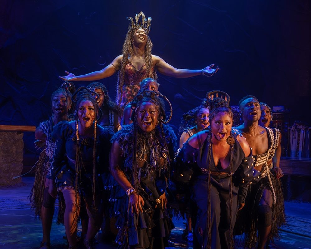 For all its dimensions and complexity, the story is easy to follow because the balance between music and narrative is skillfully maintained so that one barely misses a word. The music connotes Africa in frequent use of call-and-response vocals and powerful rhythms, enhanced particularly by Senegalese percussionist Aba Diop, part of the on-stage band that accompanies many of the numbers. But the more prominent musical sources are jazz, blues and Broadway recitative. The melodies are intricate and demanding on the performers. This is not the sort of musical where you’ll walk out humming the tunes, but you might want to go back to hear it all again.