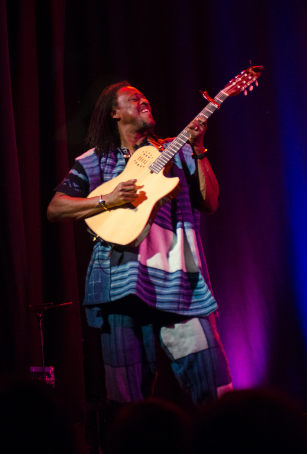 One need not have wondered. Unlike African Strings, Koite and his percussionist have a connection deepened and burnished over many years recording and performing together. Also, having played a number of shows on this tour without the expected support of Bassekou’s crew, the duo has clearly got its groove on. Koite has always been a superbly original guitarist, a master really. He plays fingerstyle on nylon strings, and these days, he likes to enlarge his sound using a harmonizer. He can drive galloping rhythms all on his own with his ferocious fingers, or coax bell-like tones from his guitar to create moody swells of harmony. He is also a spectacular singer, with a velvety midrange and sharp crying attack in his high register. Many of these subtleties are hard to fully appreciate when Koite performs with his wonderful band, Bamada.