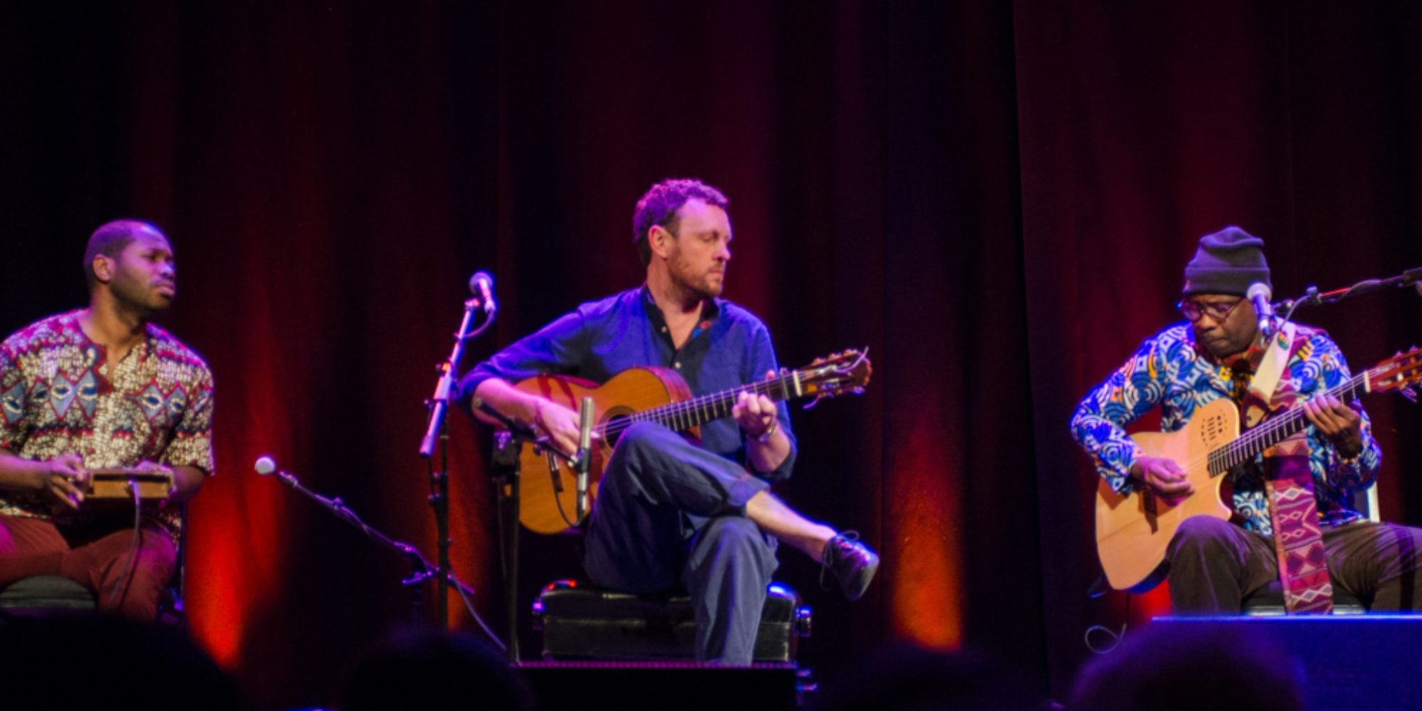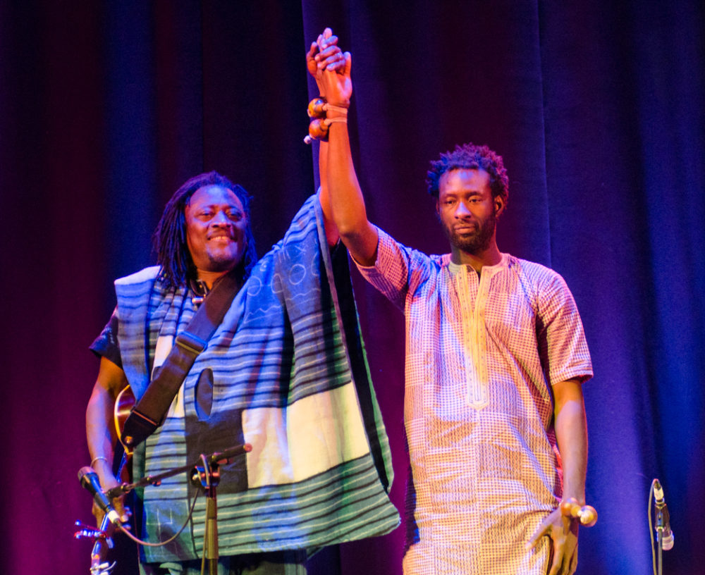 Despite all this sturm und drang, Boston presenter World Music came up with an elegant solution for this concert. The show would open with Derek Gripper and African Strings, a new project in which the South African classical guitarist, who has made a career out of playing mostly music from Mali, is backed by Congolese guitarist Jaja Bashengezi and Ugandan multi-instrumentalist Kinobe. These two outstanding musicians now live in Washington D.C., and combine their talents on each other’s work and other projects, including recently the debut album by the Congolese/American vocal duo Nsimbi.