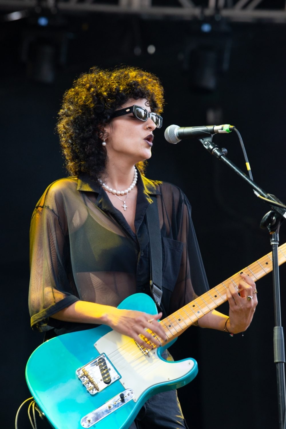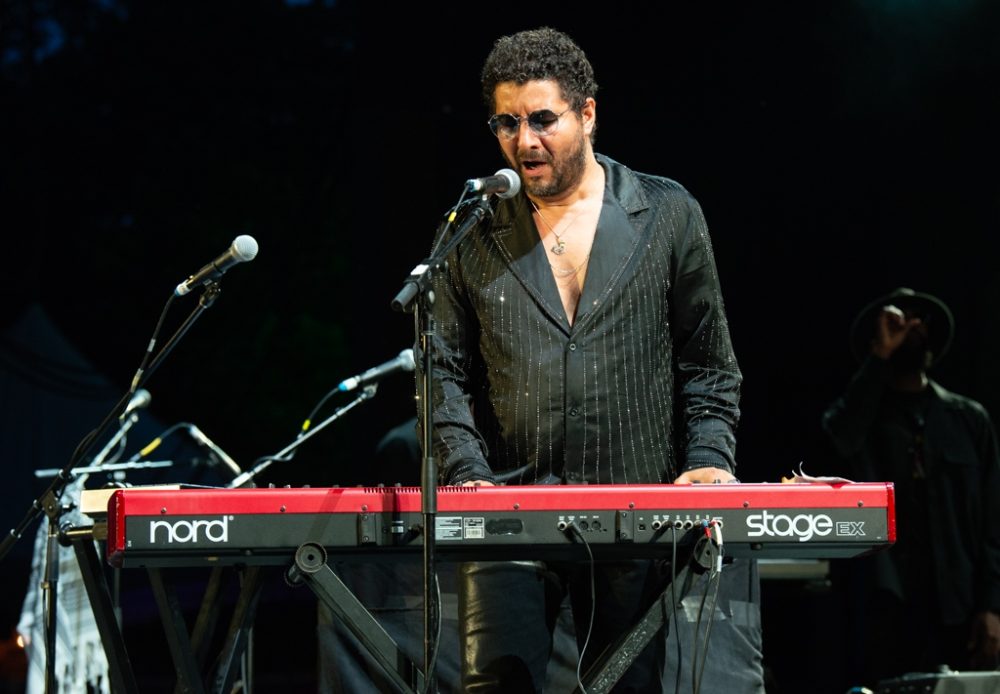 Then the band Boularés was leading switched gears to support the night’s closer, experimental electro-räi artist Sofiane Saidi. Saidi wowed globalFEST back in 2020, and made a solo appearance at the 2024 fall edition of Habibi Festival. This time, he joined forces with Boularés to present a full-band spectacle. Saidi is a powerful vocalist—more or less a requirement for any respectable räi singer—but he is equally committed to his electronic artistry, surrounded as he is by two banks of keyboards. At times, he and Boularés summoned rich sonic shrouds, building layer upon layer of sustained keyboard and saxophone sounds, luring the crowd into a kind of hypnosis.