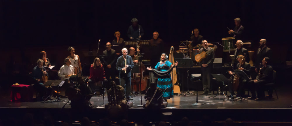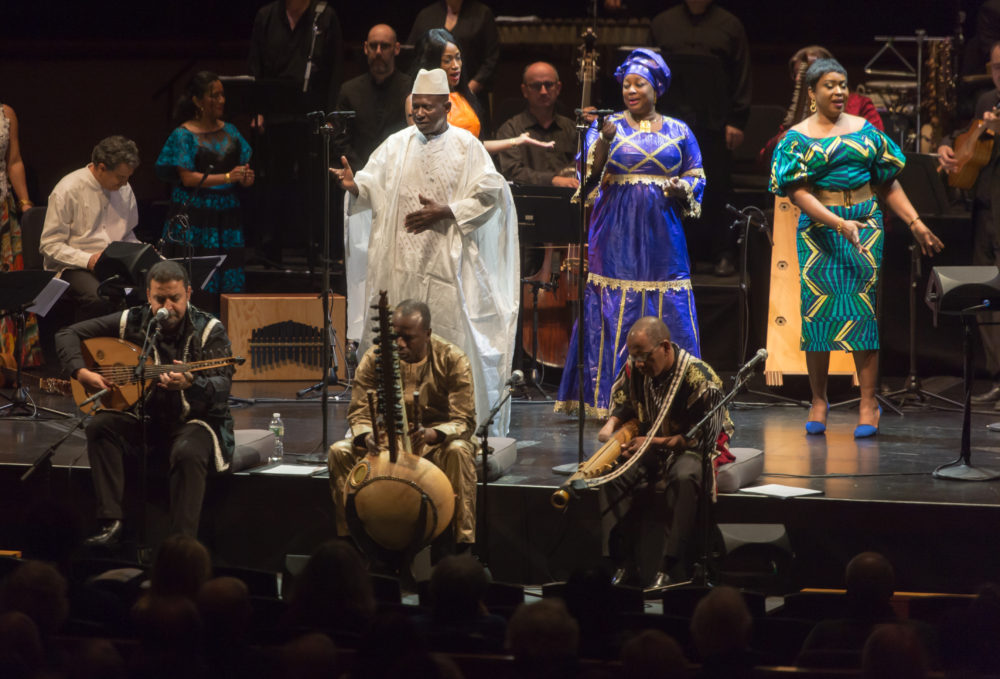 Five overlapping ensembles joined forces here, beginning with two that Savall has led for some years: Hespèrion XXI, specializing in Mediterranean music from the 10th to 18th centuries, and La Capella Reiel de Catalunya, specializing in Hispanic and Latin vocal music, notably from Catalonia. The Fairfield Four, of Brother Where Art Thou fame, brought a soulful element of African-American gospel a cappella into the mix. Then, while not a formal ensemble, a set of Malian musicians based around the kora virtuosity of Ballaké Sissoko and the vocal prowess of Kasse Mady Diabaté, one of West Africa’s most celebrated griot singers, allowed the ensemble to delve convincingly into the griot repertoire, notably in a rousing rendition of “Touramakan,” a finale that included the entire musical cast.