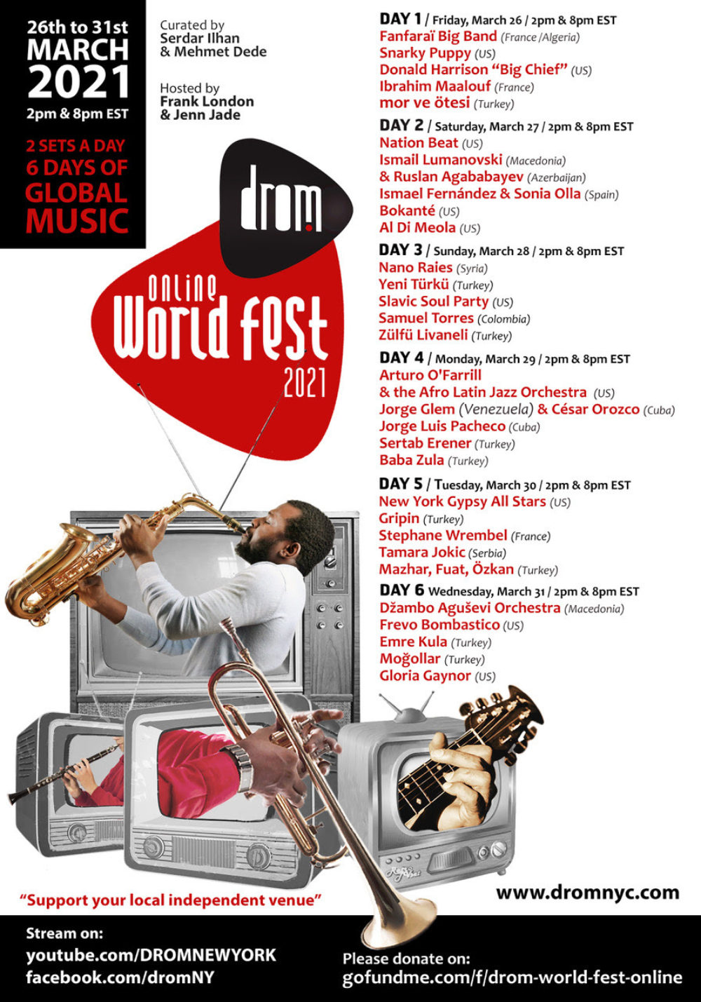 The event is free to stream on DROM's YouTube channel, but since venues have been closed for a year now, DROM will be accepting donations through GoFundMe to help them get up and running in April.