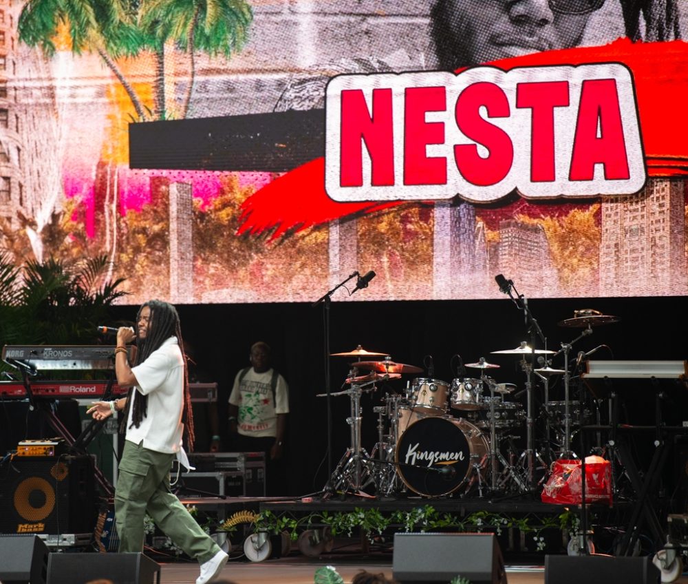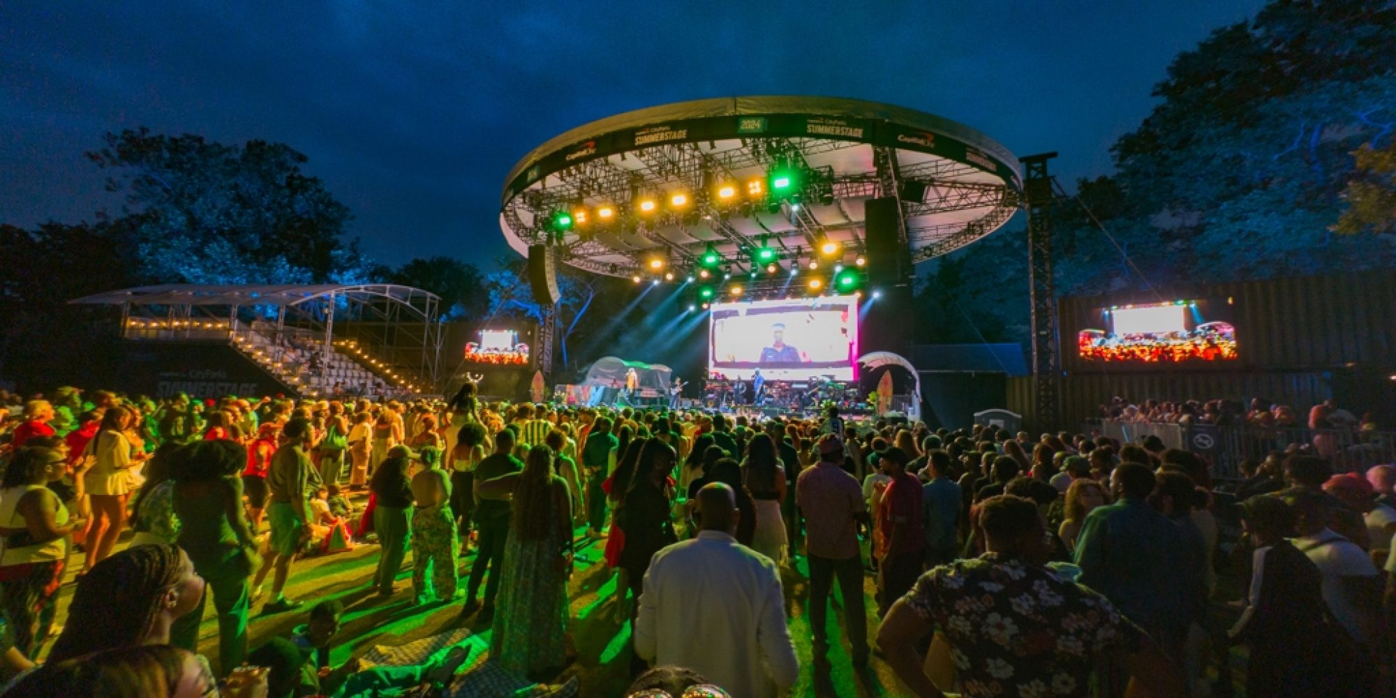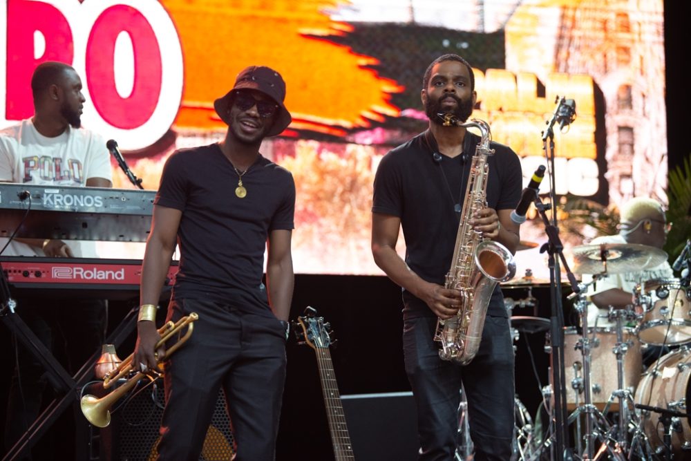 In association with Move Forward Music, the Lagos-based Palmwine Festival celebrating Nigeria’s nascent alternative music scene returned to Central Park Summerstage on August 17. The promotion said, “Founded by the Nigerian rap duo Show Dem Camp—whose sound is indebted to the Ghanaian genre Highlife, fusing African meter and western jazz melodies—the fest this year features the Cavemen, a highlife duo comprising the siblings Kingsley Okorie (bass) and Benjamin James (drums). Their latest LP Love and Highlife is a rumination on culture, community, and humanity that features trumpeter Etuk Ubong and Made Kuti, the multi-instrumentalist son of Afrobeats legend Femi Kuti.”