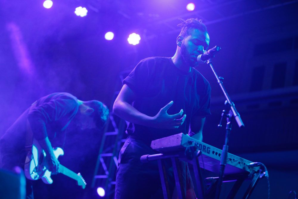 This Mozambican group is an audiovisual project, apparently a reminiscence of independent Mozambique’s early years, though the connection is not all apparent. Ailton Matavela and Tiago Correia-Paulo join to make sweeping, melancholy electronica with shades of Radiohead and Tamino, backed by poetic video projections and shrouded by stage smoke. The Cape Verdean audience, that had just prior been dancing to local rapper Ga Da Lomba, swayed to the sounds.