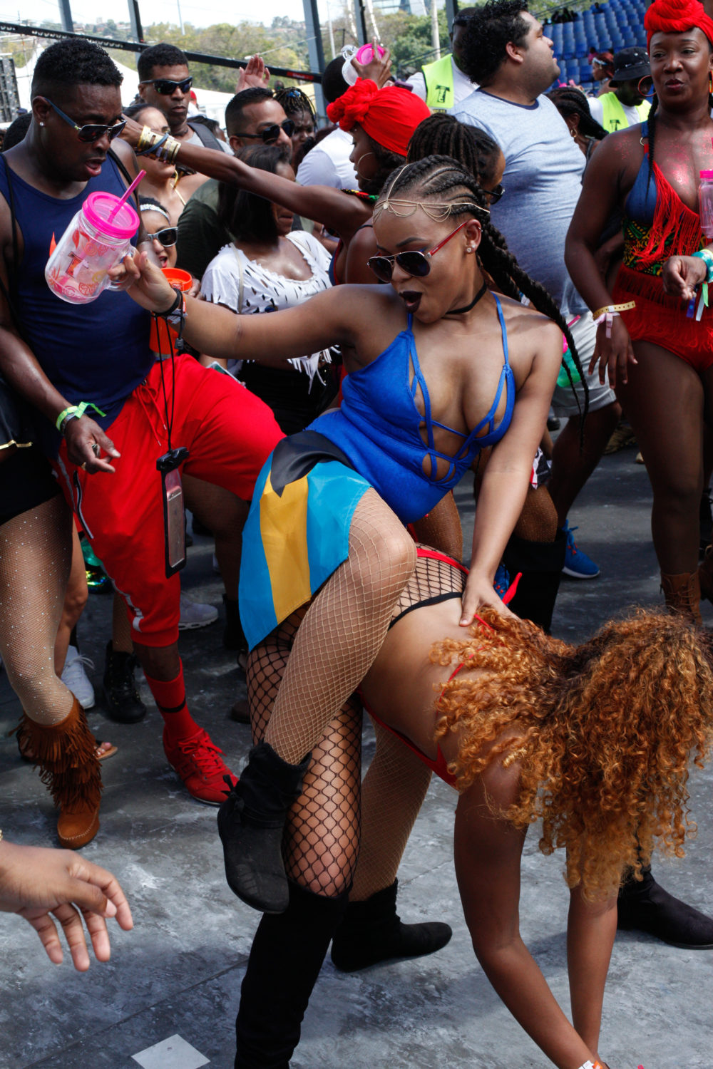However one chooses to masquerade, if you take to the road Carnival Monday and Tuesday, you will be joined by hundreds of thousands of others, dancing and drinking down the streets from dawn till night. Bands are fueled by bars on trucks and 18-wheeler sound systems blasting soca hits full blast. Monday is more like casual mas, with simple outfits often of individuals' own designs. Here are some photos from the road and stage on Monday. Photos by Sebastian Bouknight.