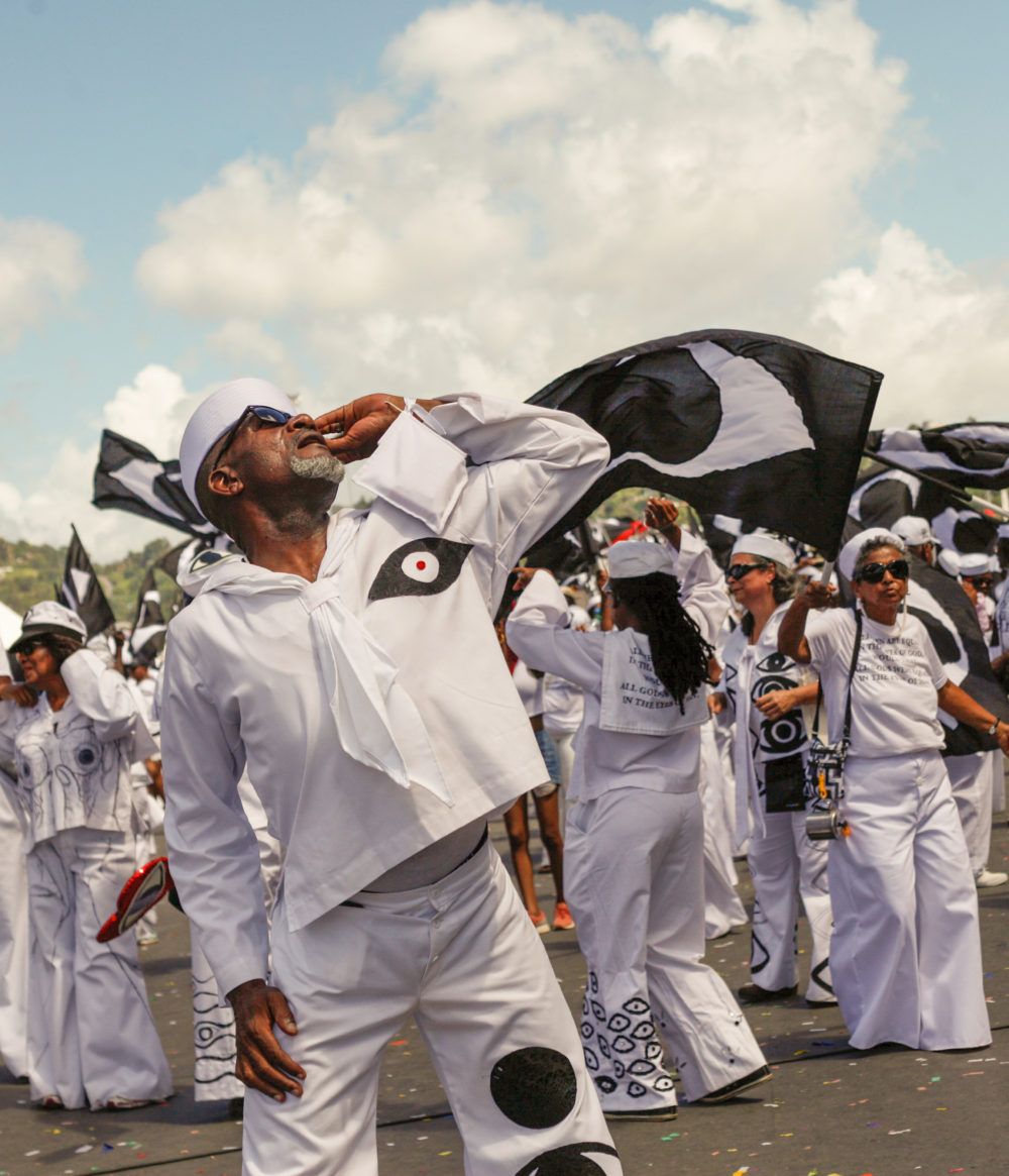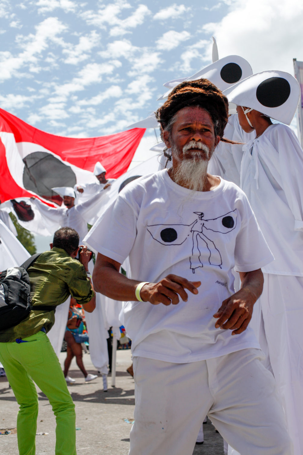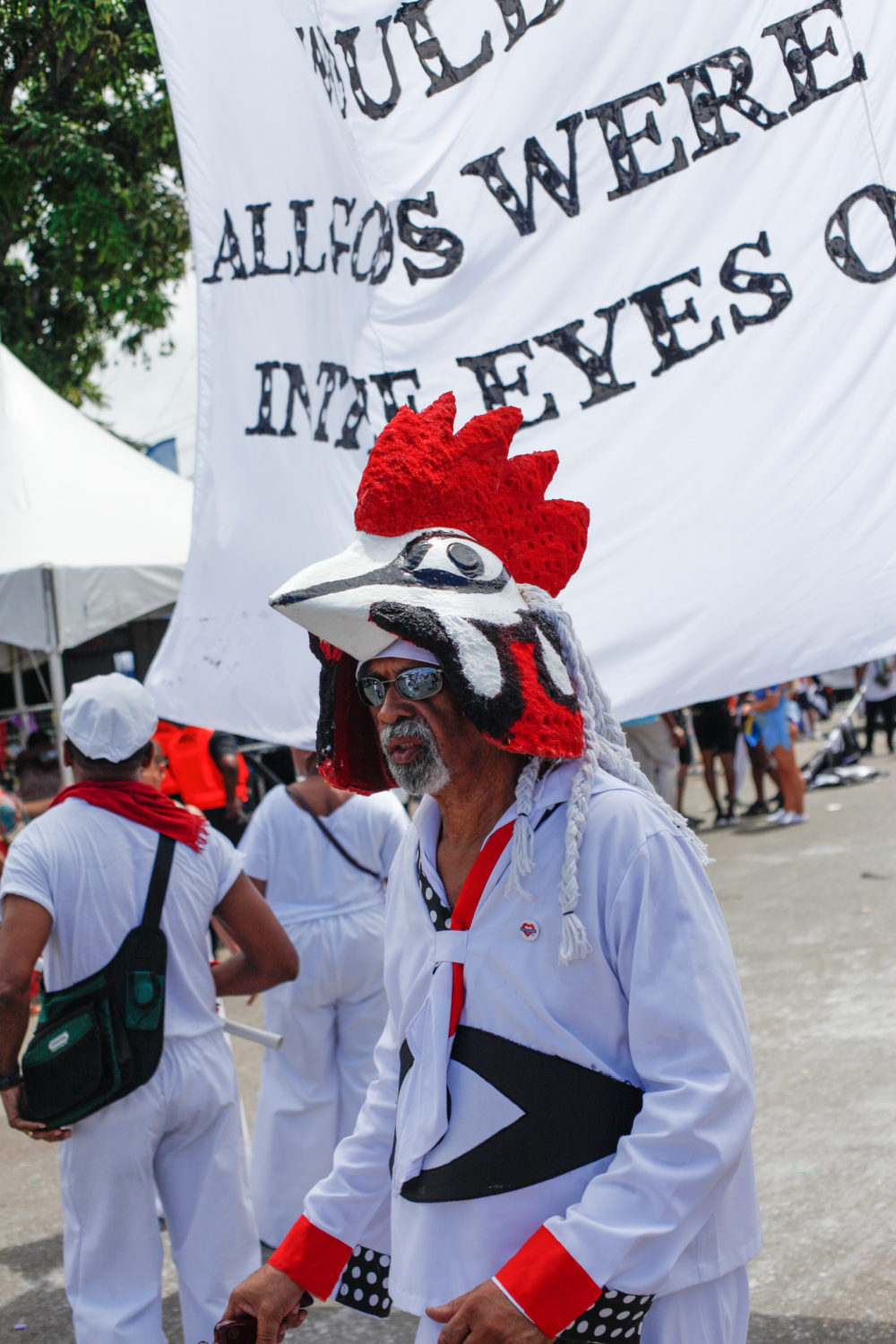 His mas costumes over the decades have been magnificent and stunningly creative. This year, he came out with a gorgeous band called the Eyes of God. It was simple but potent: white pants, white tees and sailor shirts and white sailor hats. The shirts and pants were hand painted with bold, black designs and printed with text that read: