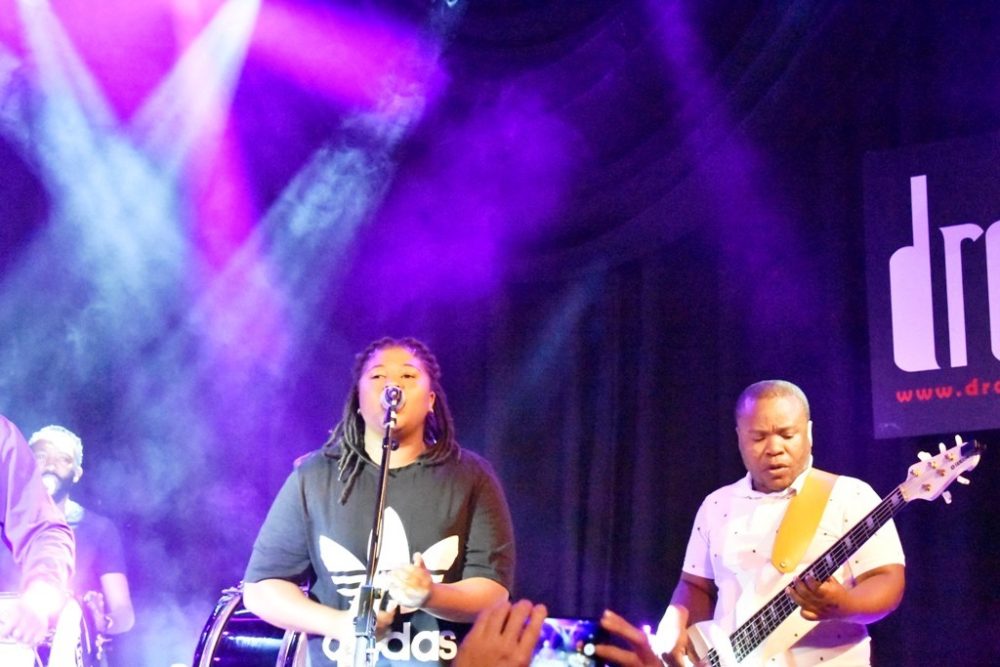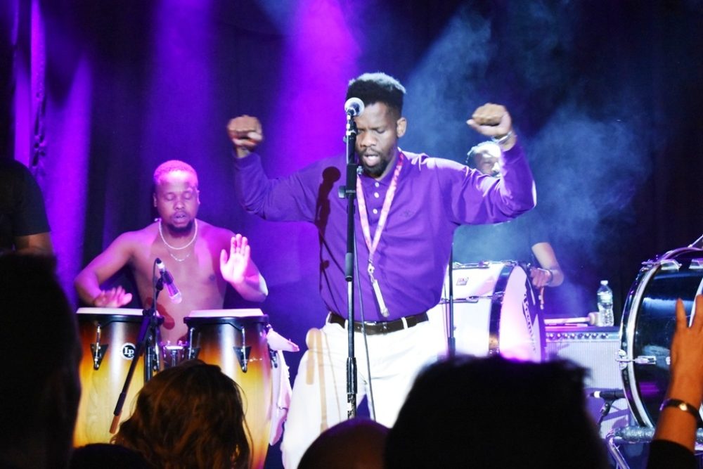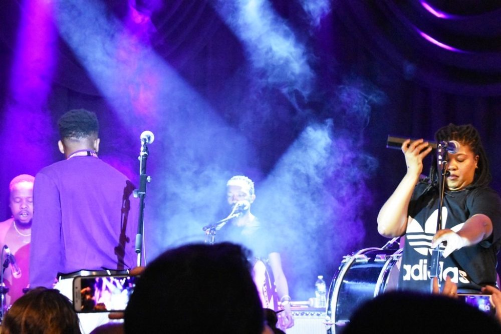 The South African group BCUC was in town for Sunday’s globalFEST, but they were the secret guest at the DROM showcase on Saturday. With all the groups playing half-hour sets, BCUC only got to play two abridged versions of their trademark extremely long songs. But even if the group’s jamming was attenuated, the intensity sure wasn’t. It reminded me of the hardcore shows I’d go to in high school, all sweat and raw throats, but much better on rhythm and many more mini-sermons about respecting and loving our parents and grandparents.