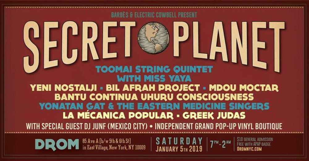 Instead we’ll focus on the other two shows I attended. The Association of Performing Arts Professionals (APAP) was in town, and after two days of the conference in a midtown hotel basement, they redeemed themselves with a stellar showcase down at DROM in the East Village Saturday night, featuring Toomai String Quintet with Miss YaYa, Yeni Nostalji, Bil Afrah Project, Mdou Moctar, BCUC, Yonatan Gat and the Eastern Medicine Singers, La Mecánica Popular and Greek Judas. Niger's Mdou Moctar also played a sold-out show at Baby’s All Right in Williamsburg on Friday.