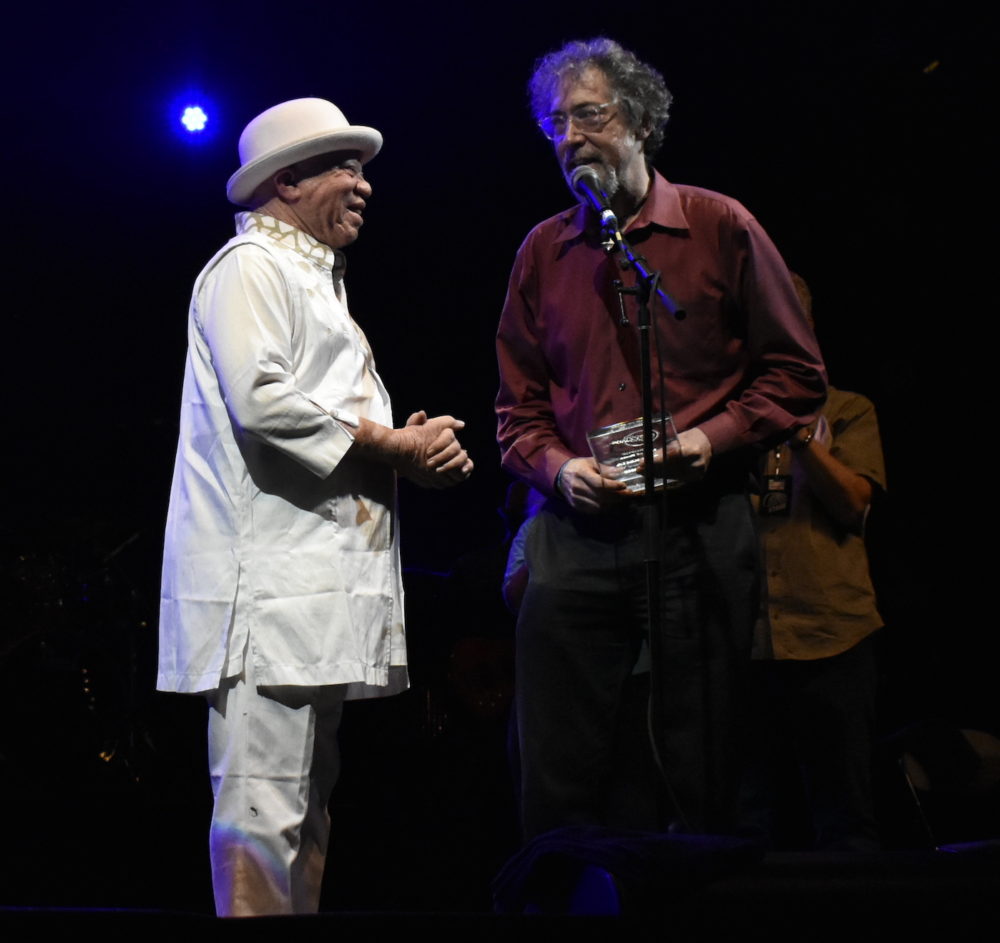 On Saturday night, July 13, on stage at the BRIC Celebrate Brooklyn! Festival, we inducted maestro Salif Keita into the Afropop Hall of Fame. It was a magnificent night of music and honoring one of Africa’s greatest artists. Afropop’s Sean Barlow got the crowd roaring in anticipation of Salif’s performance. Sean announced that the singer/poet/guitarist/bandleader and social activist, now celebrating his 70th year, was also celebrating his 50 years as a professional musician. Sean recalled Salif’s storied early days as lead singer with the Super Rail Band, and later Les Ambassadeurs Internationaux, and his subsequent breakthrough recording Soro in 1987 as a solo artist based in Paris. Over the years, Salif has collaborated with the likes of Carlos Santana, Joe Zawinul, Cesaria Evora, Vernon Reid and Snarky Puppy. The list is long…. Sean noted, “The instant you hear Salif’s powerful voice, you know it’s him by its signature timbre, unlike any other artist.” The Brooklyn crowd roared in agreement.