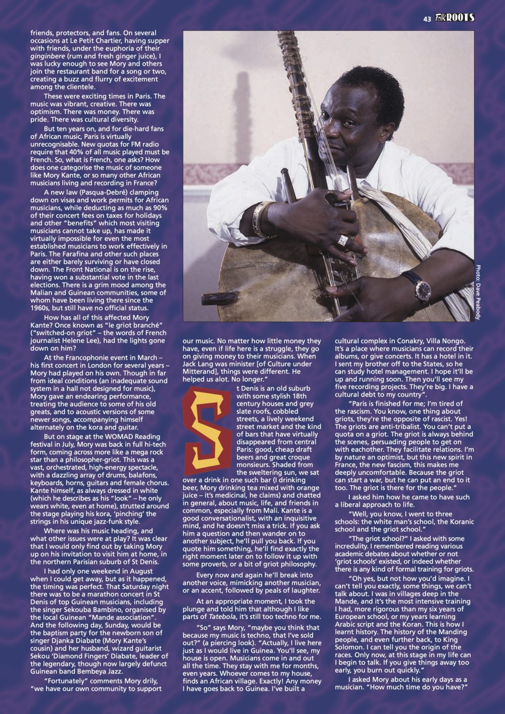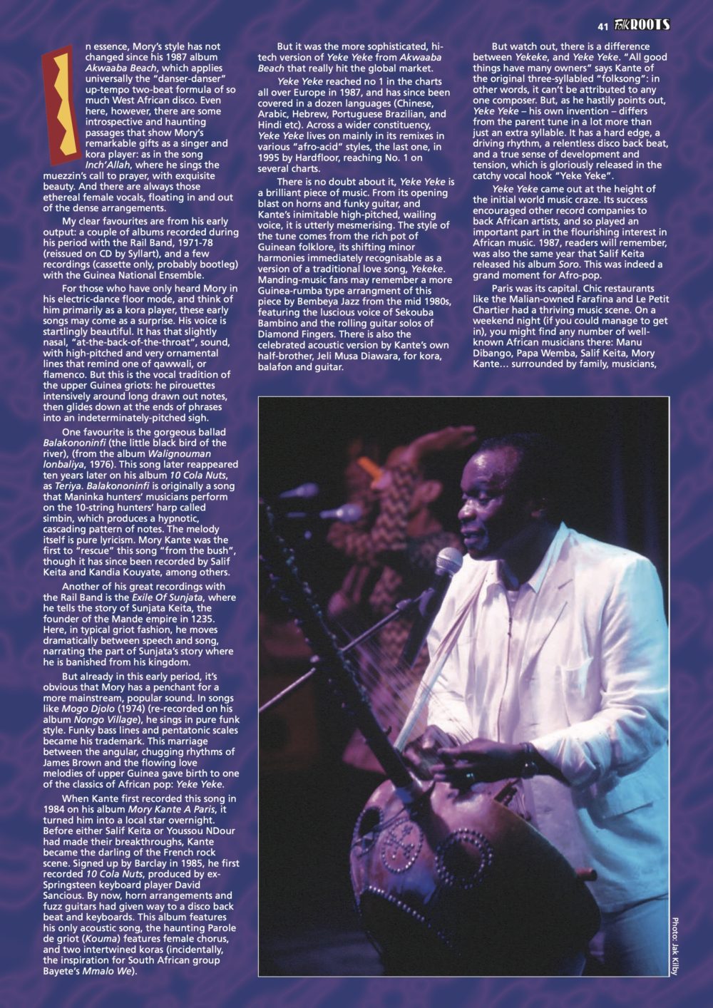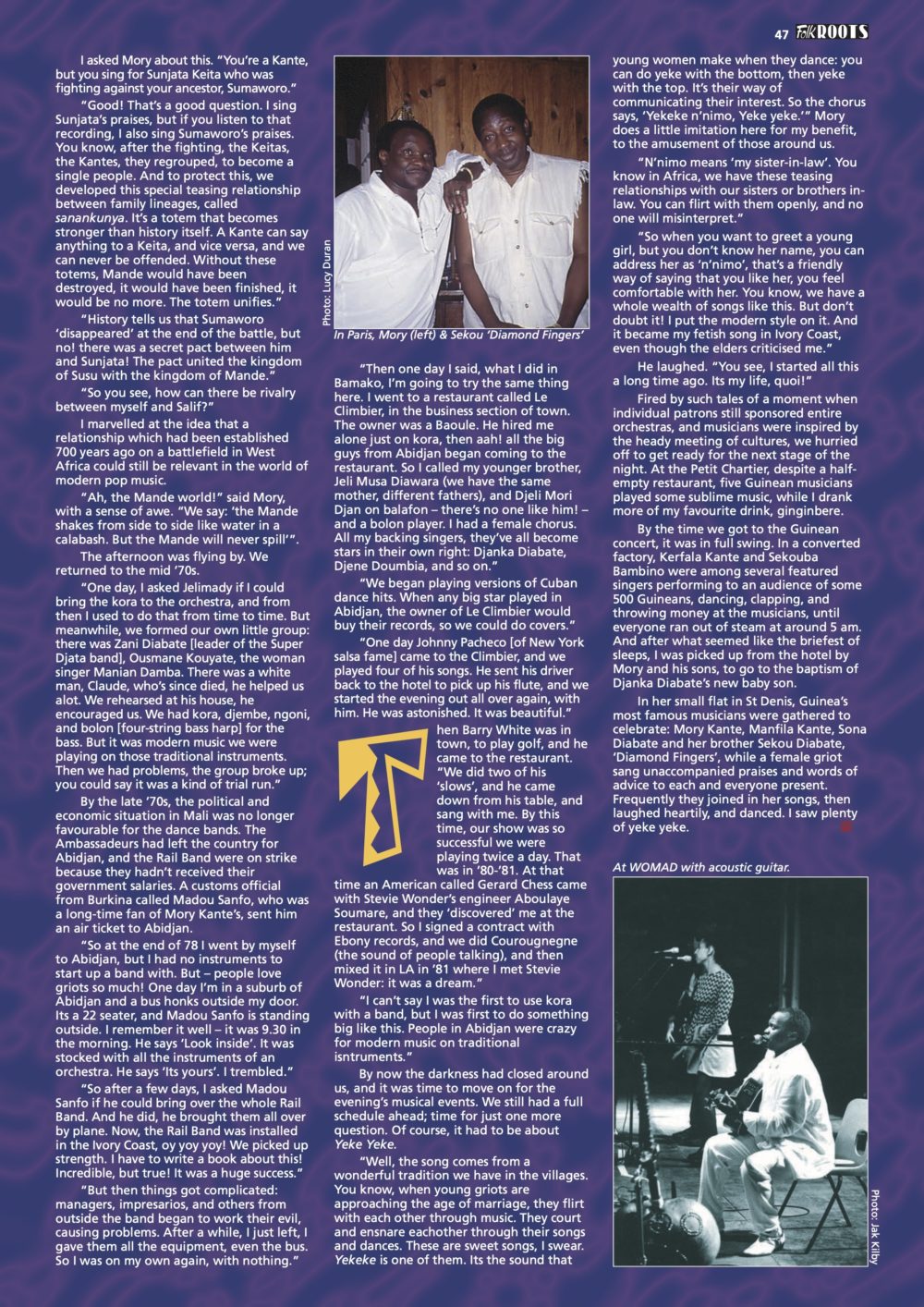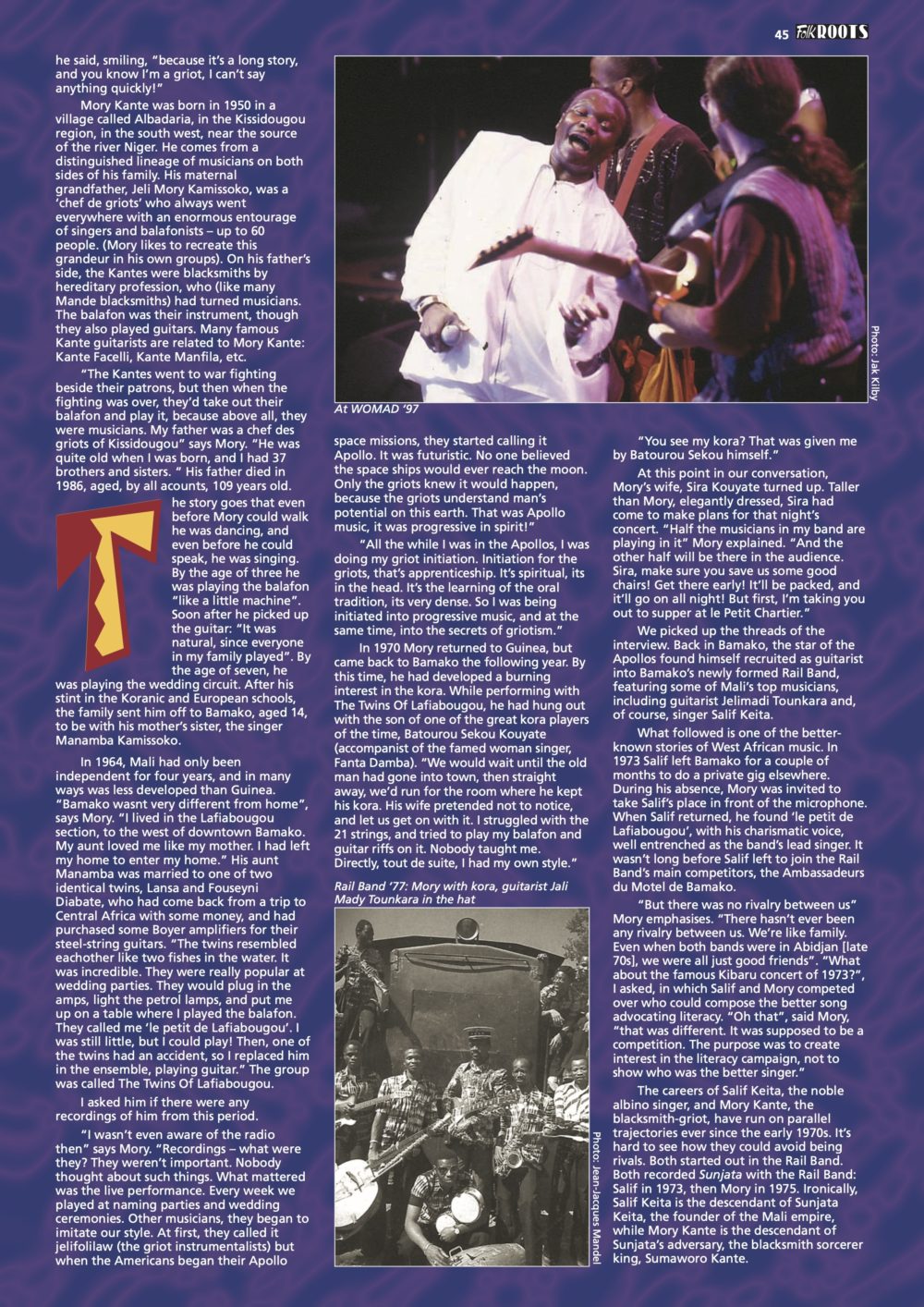 In memory of Mory Kante, we bring you a wonderful article written by Lucy Duran for Folk Roots magazine in 1997. Lucy has gone as deeply into Mande music culture as any Westerner we know, and she has a great story to tell about her encounters with Mory. Thanks to Lucy and Ian Anderson for permission to reprint this fine piece of writing in memory of another fallen hero of African music’s golden age.