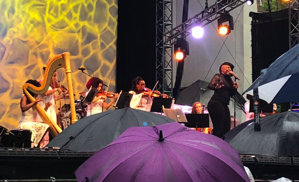Tamar-kali's Psychochamber Ensemble was the first to take the stage at Lincoln Center’s Out of Doors on Wed., July 25. The group is composed of Tamar-kali, a singer and film-score composer whose vibrato massaged my eardrums, and an all-female band composed of background singers, violinists, cellists and a harp player. Her compositions included post-punk '80s songs set to string instruments..