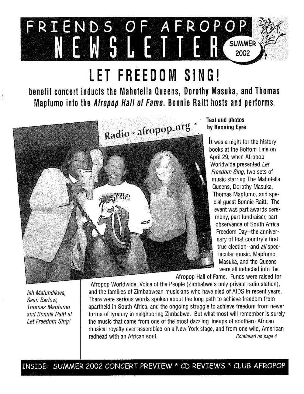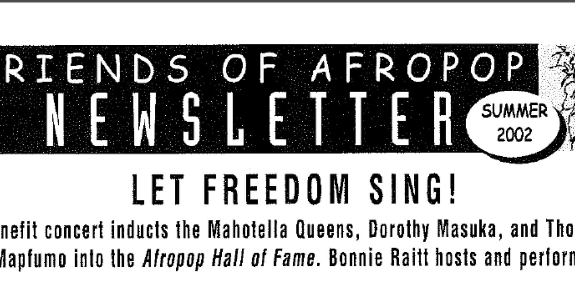 One physical bit of our past that surfaced recently are copies of our old year-end newsletter from 2000 and 2002, which had accounts of parties celebrating our 12th and 14th years. At the turn of the millennium, Habib Koite and Bamada played, as did Oumou Sangare and her band. In 2002, Bonnie Raitt, musician and longtime friend of Afropop, helped us induct Thomas Mapfumo, Mahotella Queens and Dorothy Masuka into the Afropop Hall of Fame.