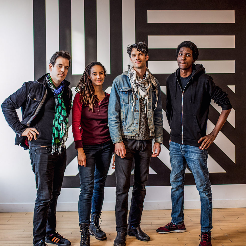 There are four of us as the core band. All are great singers and instrumentalists. So that's been really fun to be able to explore harmony singing and layering vocals and things like this. Rob Flax grew up in Chicago. He got his masters here at NEC [New England Conservatory of Music]. He’s a multi-instrumentalist who plays violin and synthesizer in the band and sings. And then we've got Zamar Odongo who plays drums and also sings as well. And then Krista Speroni playing bass and singing.