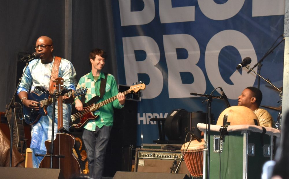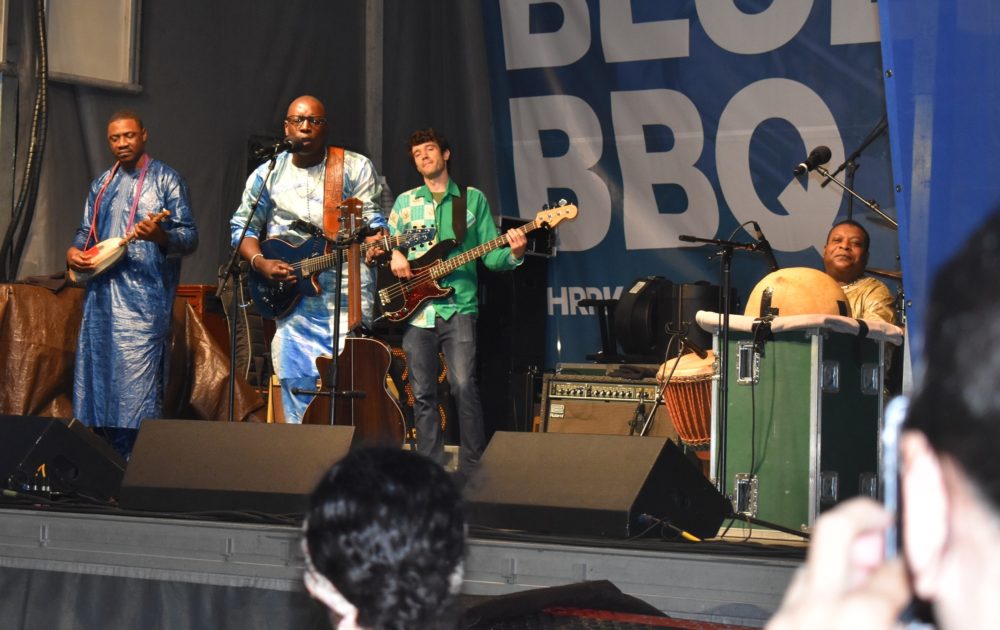 Maybe it was the spirit of the Sahara, from whence these Malian musicians hailed, or maybe it was just a small shower to begin with, but the rain stopped before their first song did. And the people who remained seemed to be the true believers, ready when Vieux invited—or perhaps strongly advised—people to get up and dance. They set aside their umbrellas, took off their ponchos and moved.