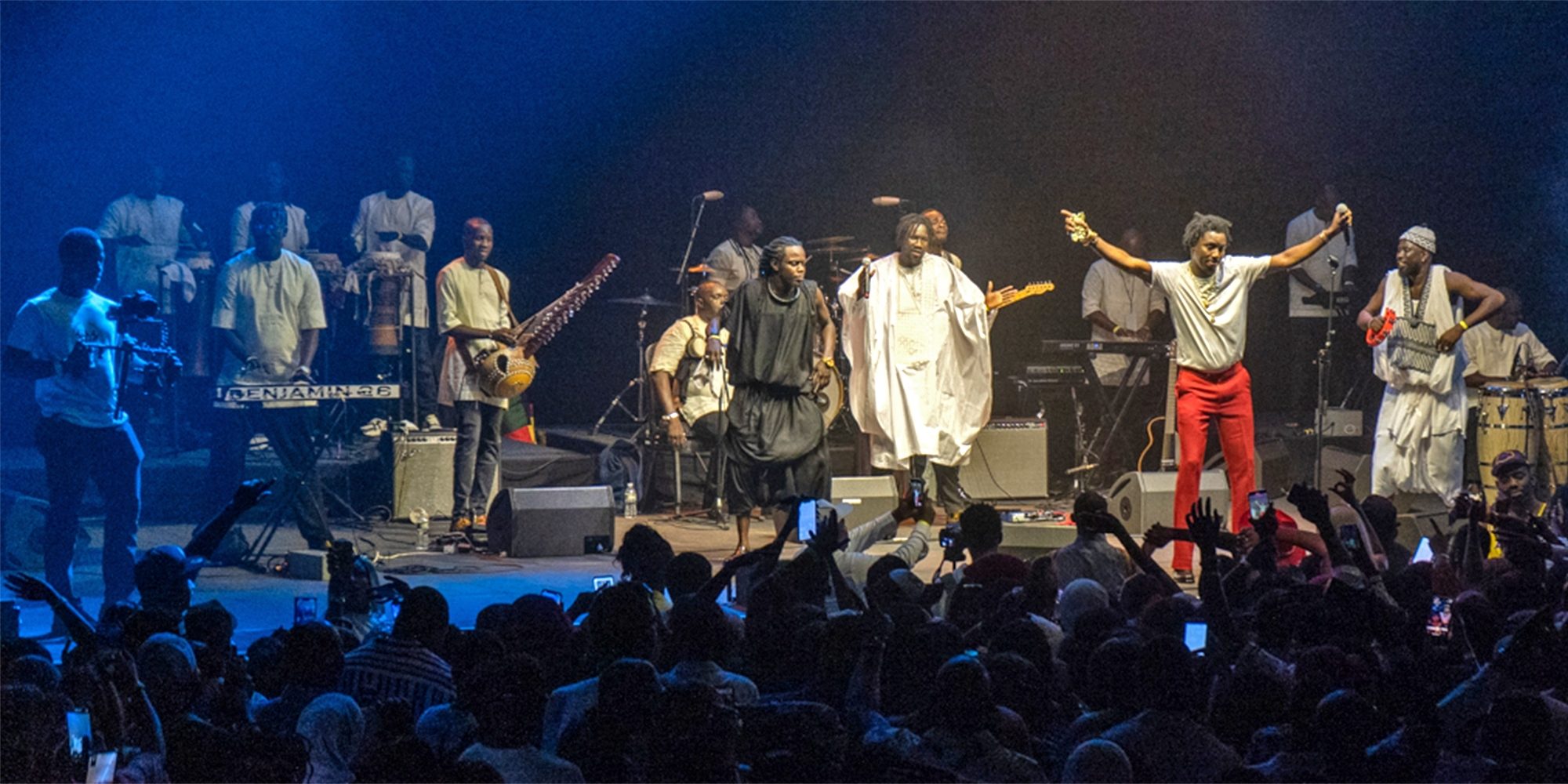 This show delivered on what Thione Seck used to call his specialty: mbalax pur et dur. Pure and strong. The essence of this style is a band on fire with the fierce, furious rhythms of mbalax, contrasted with a soaring, serene vocal that sails overhead resulting in a paradoxical tranquility, a peaceful hypnosis that transforms the band’s orchestral tumult, perhaps as a lion tamer calms his ferocious companion. Wally has all of that delicious tension going on in his show. Plus, he is a warm, charismatic front man whose connection with the audience, his band and invited rappers, singers and dancers who joined him at points during this show, is undeniably genuine. Although I was among the few non-Senegalese in the hall, I felt every bit welcome, indeed, part of the family.