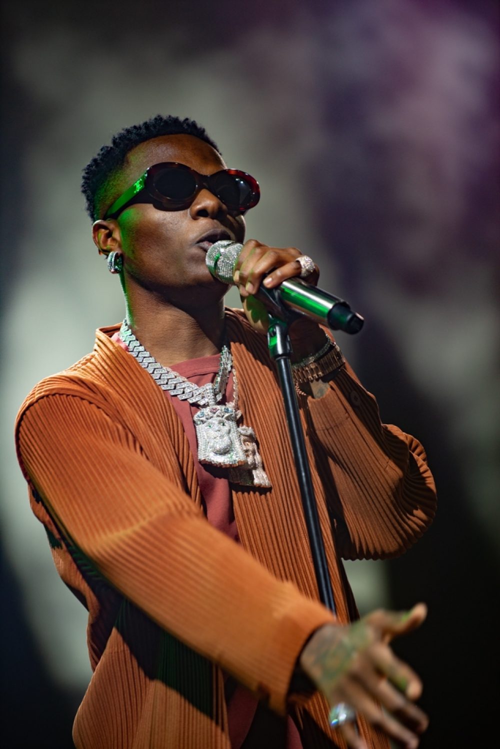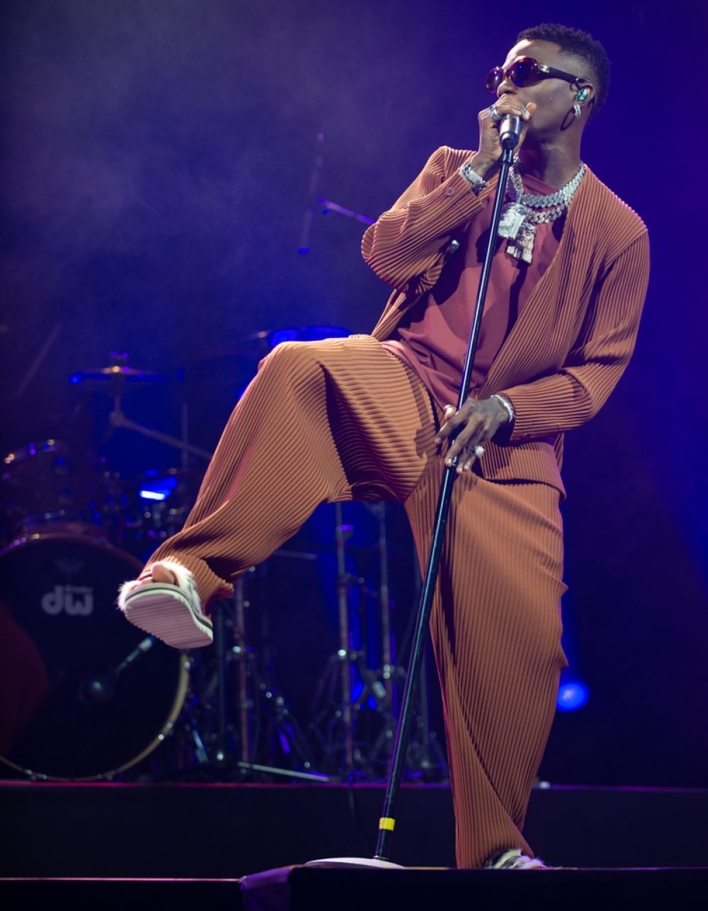But none of that mattered when he did appear, lanky, loose, bejeweled, and ready to party. Wizkid’s moves are large, fluid and playful, all nicely complemented here by his baggy, peach-colored outfit. You really can’t take your eyes off the man, as he owns every corner of the stage. The music came across as more driving and forceful than on his four albums. Songs that play as suave neo-soul in recordings pounded forth boosted by mega bass throb and sharp backing from Wizkid’s live band—guitar, bass, drums, keys and, of course, DJ Tunez. Wizkid’s 2020 album Made in Lagos, produced the hit “Essence,” the first Nigerian song to make the Billboard Hot 100. I had asked fans for a favorite song, and a few cited “Essence,” particularly the remix featuring Justin Bieber. But there was no broad agreement; every fan had his or her pick.