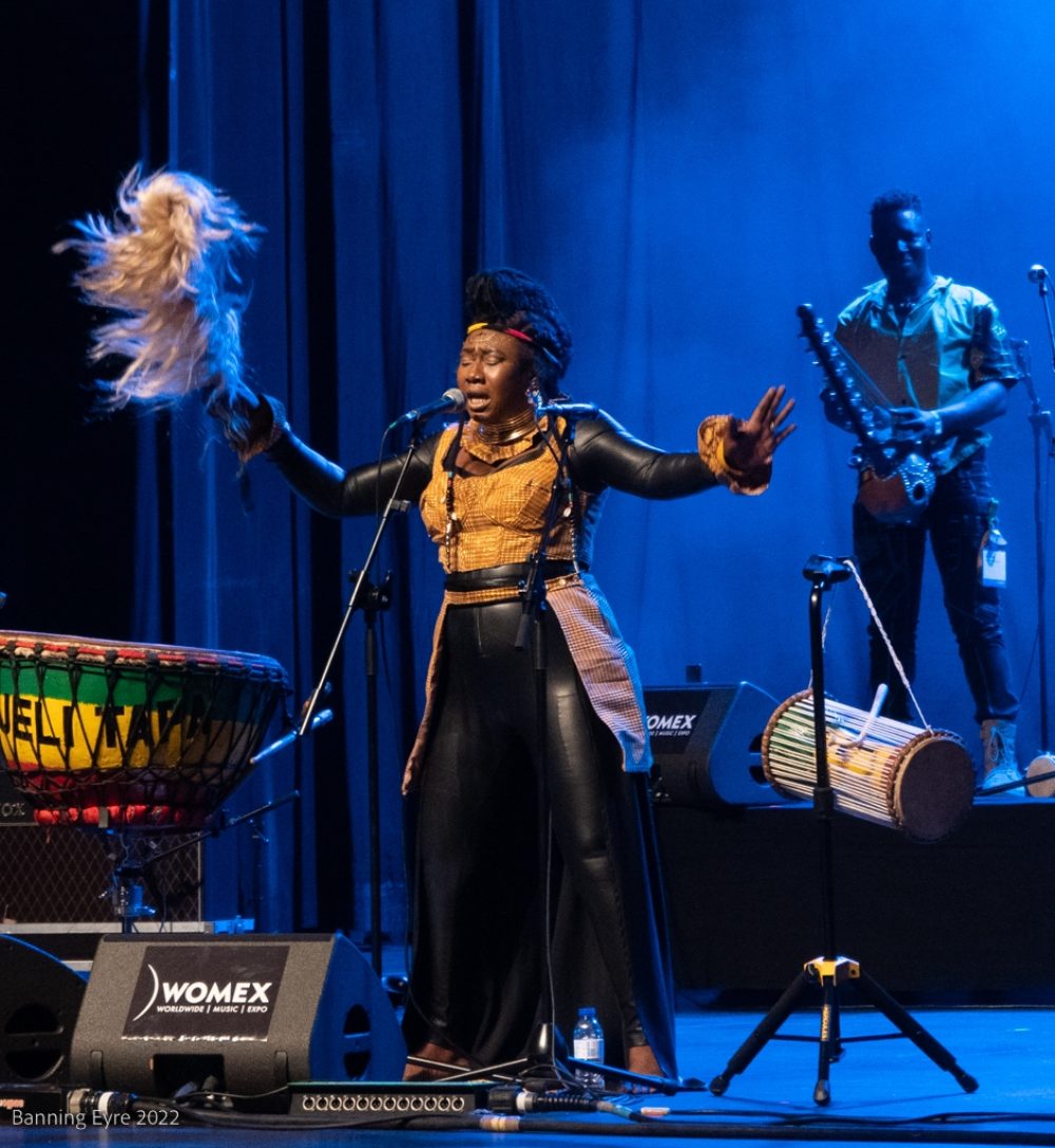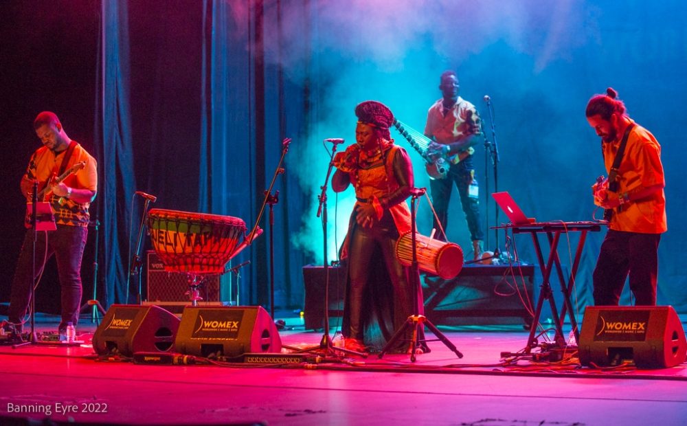 Daughter of Malian jelimuso extraordinaire Kandia Kouyate, and a self-proclaimed champion of Afrofuturism, Montreal-based Djely Tapa has already appeared on two Afropop Worldwide programs in 2022, most recently in her impromptu Nuits d’Afrique set with guitarist Derek Gripper and kora player Zal Sissoko. At WOMEX she unleashed the power of her own band, delivering a forceful and original take on 21st century Mande pop.