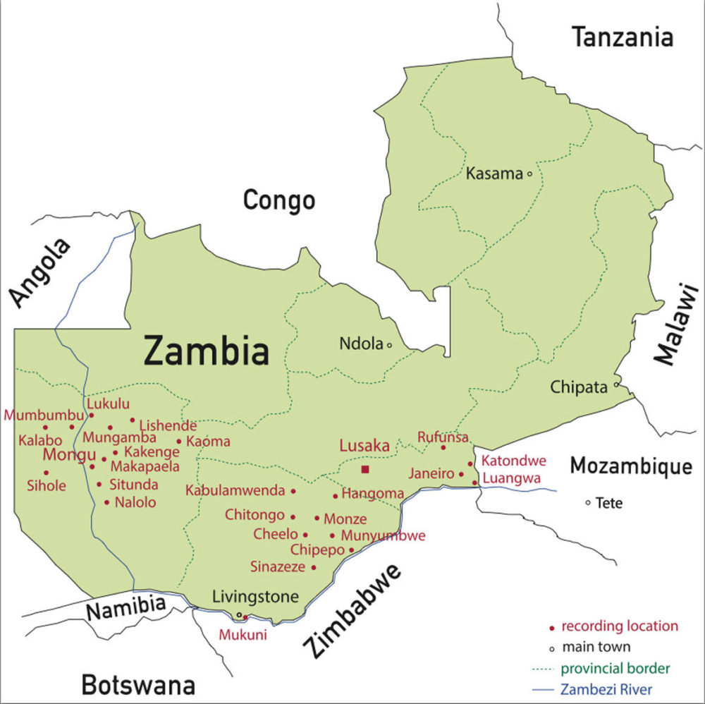 After visiting the Tracey archive in 1996, Baird continued up to Zambia and Zimbabwe on his first recording trip, inspired by Tracey’s lifework. But most of the recordings in these new volumes come from two expeditions in 2016 and 2018. If you look at a map of where he recorded for these two volumes, you will note that all the work was done in the southern half of the country, in five of its 10 provinces. This was mostly a matter of where he found opportunities to travel with friendly helpers and affordable transport.