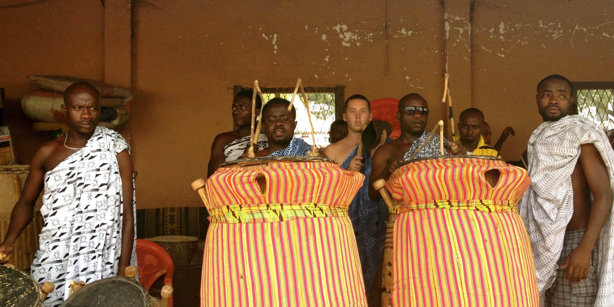Attah & Ben playing Asante Fontomfrom drums at the Asante King's palace in Kumasi